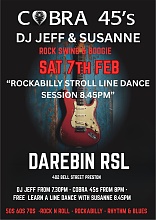 Cobra 45s and DJ Jeff & Susanne return to Darebin RSL Sat 7th FEB for what has become one of the hottest Dance nights in town. Non Stop Dance music from 7.30pm - Line dancing with Susanne and DJ... [Read More]